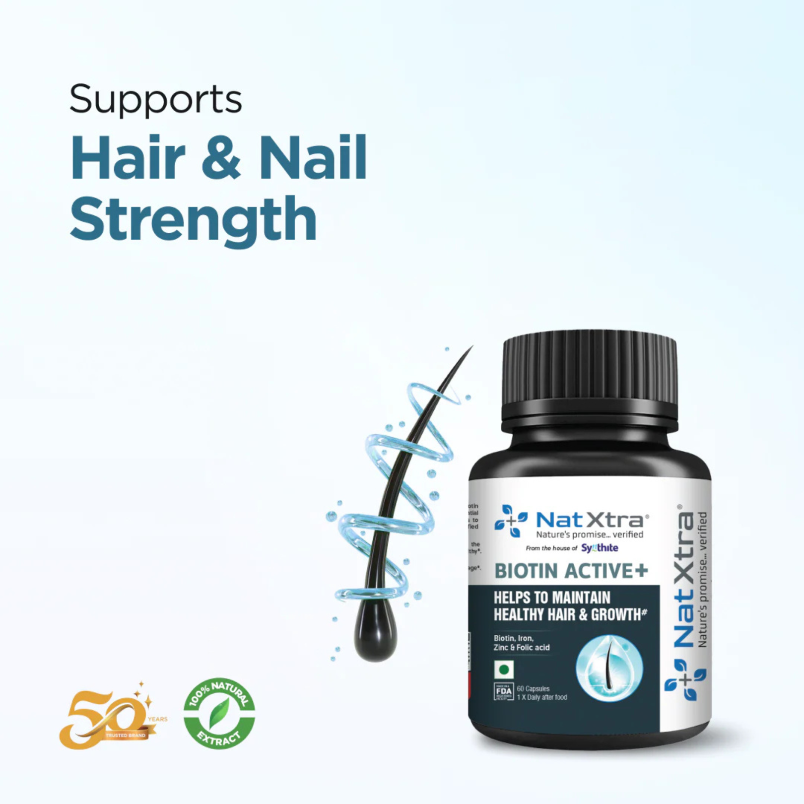 Nourish your hair, skin, and nails from within with Biotin Active+, a premium supplement formulated with Biotin, Iron, Zinc, and Folic Acid. Each capsule supports stronger hair growth, glowing skin, and healthier nails — while promoting overall vitality and energy. This combo pack of 2 bottles (60 capsules each) ensures a full four-month supply for consistent, visible results.