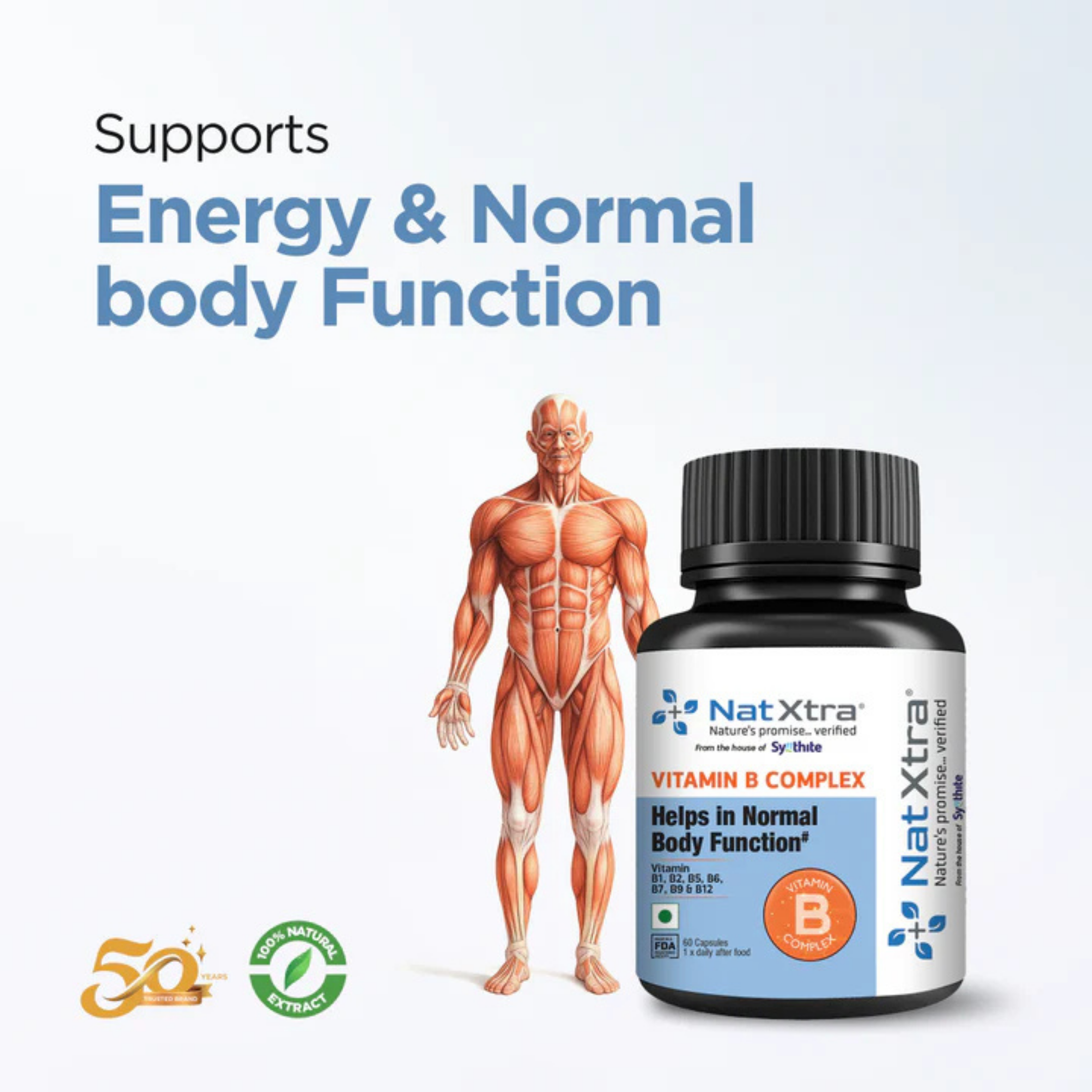 • Vitamin B Complex aids in maintaining normal physiological functions by supporting essential metabolic processes and cellular activities. B vitamins serve as coenzymes, facilitating numerous enzymatic reactions involved in metabolism, neurotransmitter synthesis, and DNA repair.