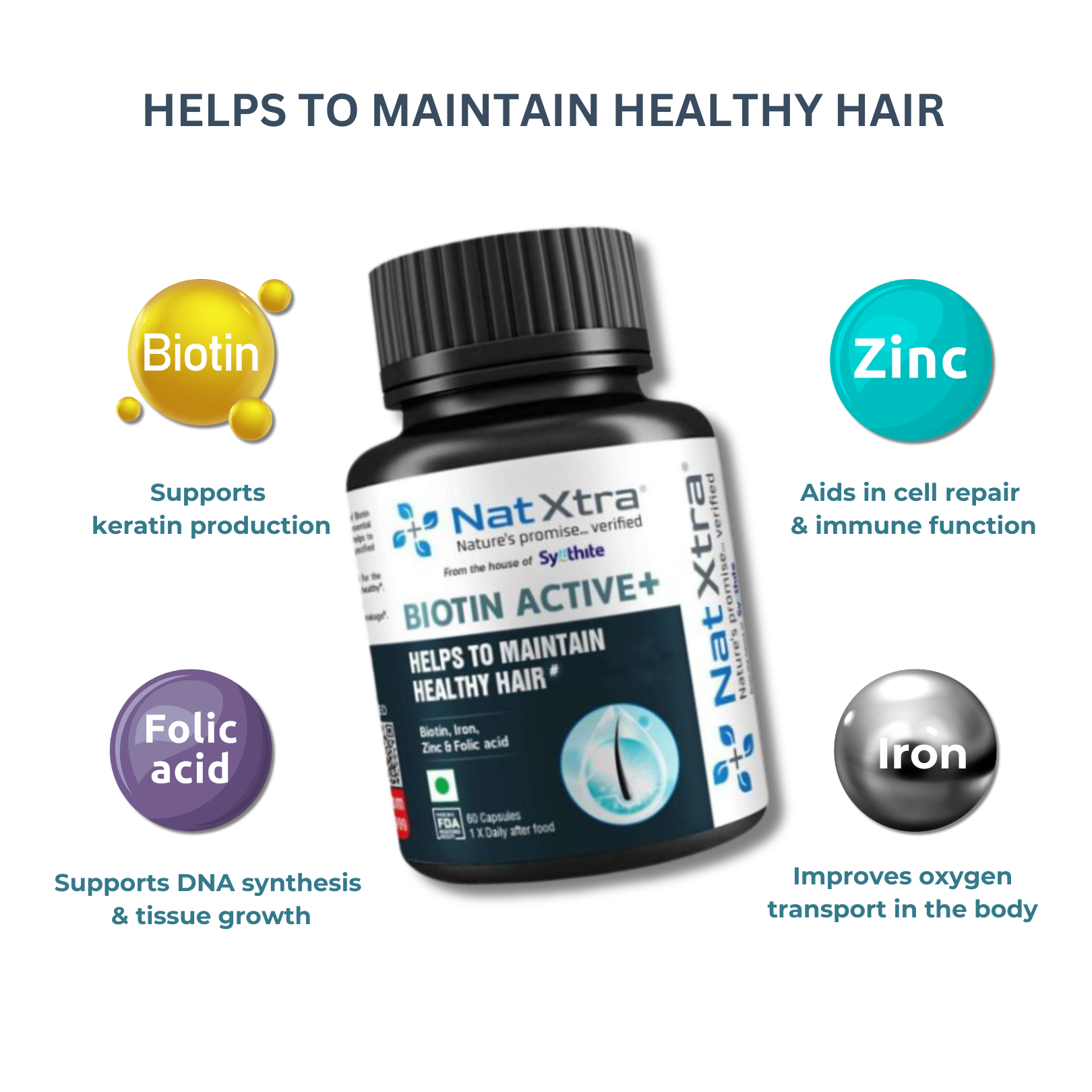 Natxtra Supplement | Improve hair health and promote hair growth with a potent combination of Biotin, Folic acid and Iron Promotes Hair Growth | Pack of 60 Capsules.