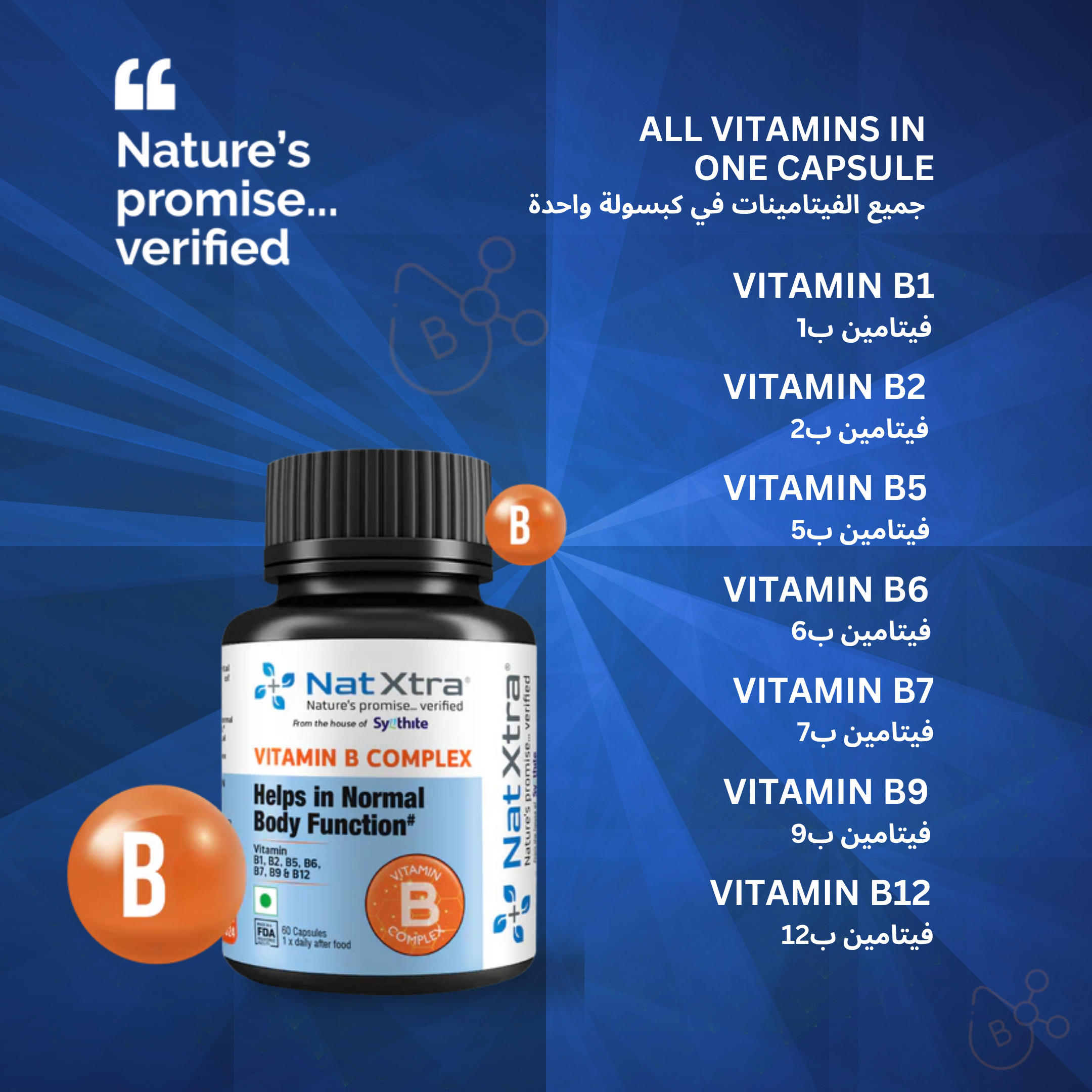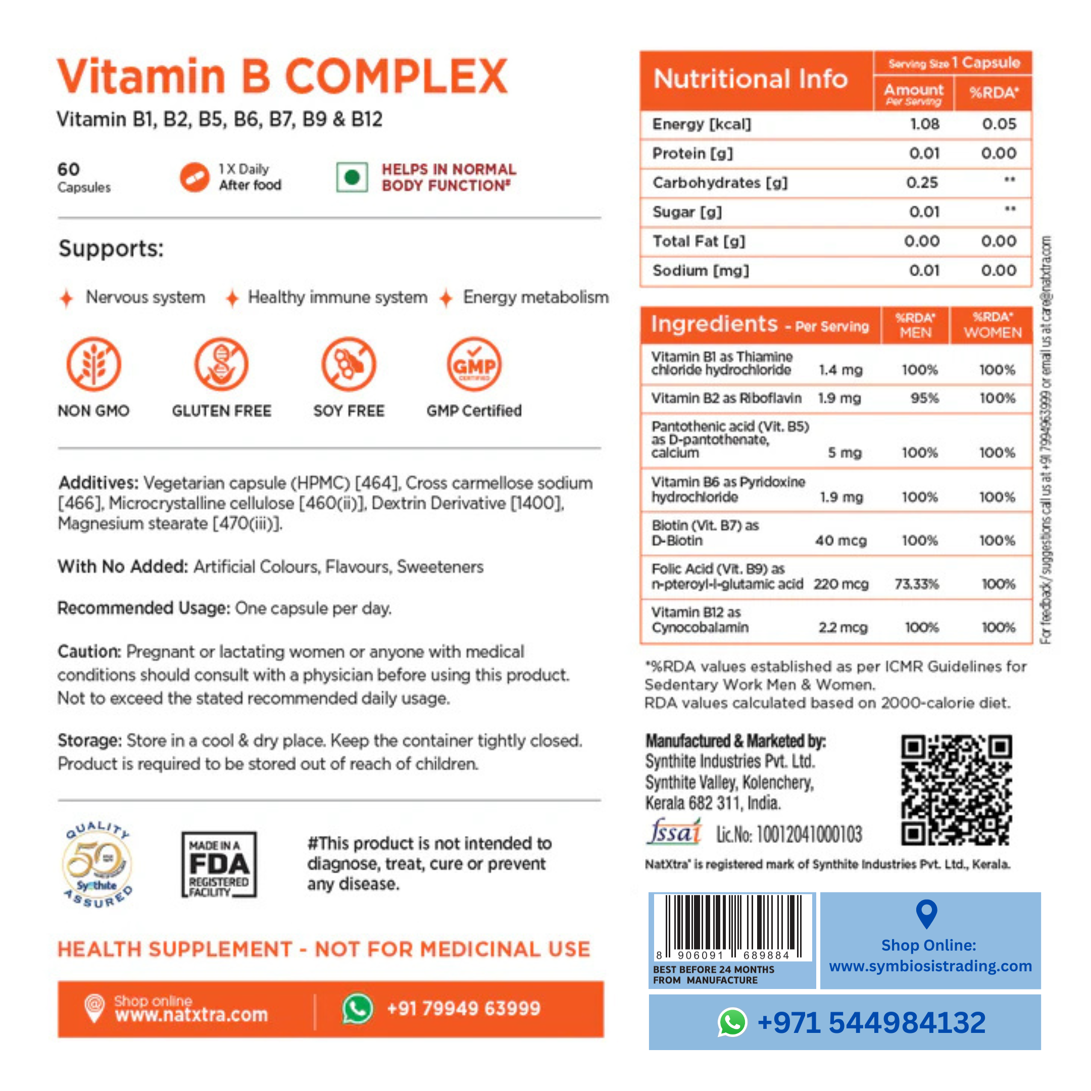 • Ingredients: Each capsule of Vitamin B Complex is enriched with the goodness of a highly potent combination of Vitamin B1, B2, B5, B6, B7, B9 & B12.